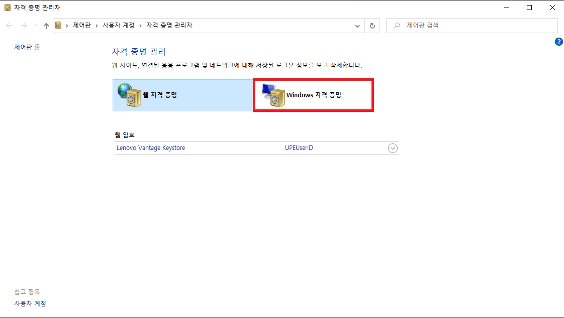 - 왼쪽하단 검색창에서 "자격 증명 관리자" 입력 후 검색한다.