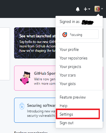 - 로그인 후 오른쪽 위 메뉴를 클릭하여 Settings를 선택한다.