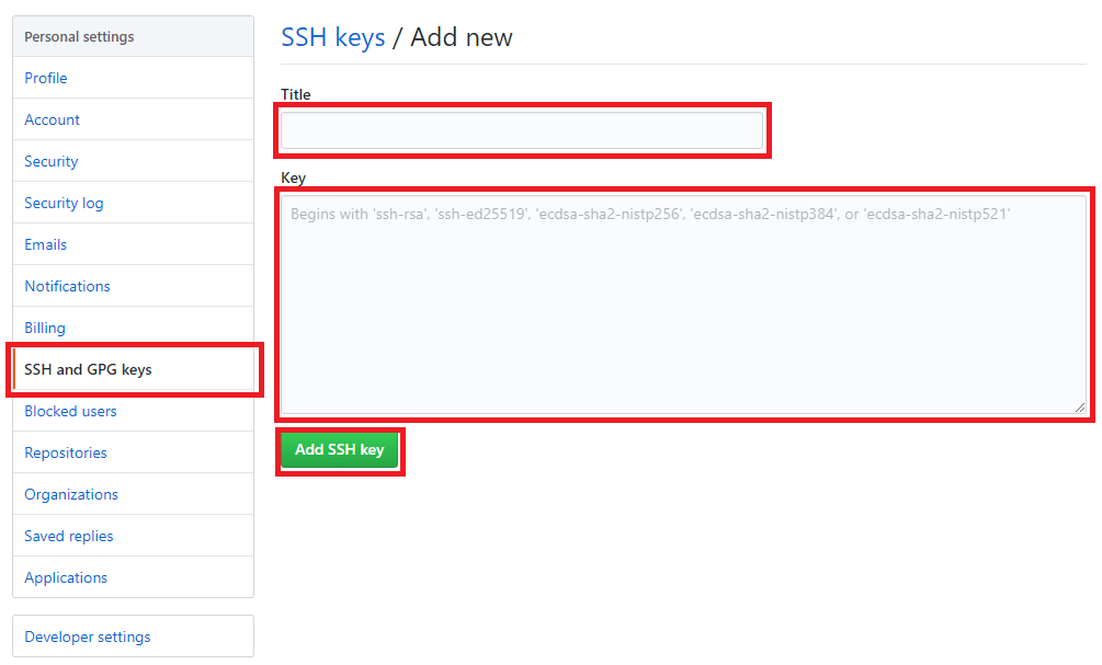 - "Title" 과 "Key"를 입력후 "Add SSH key"버튼을 누른다.