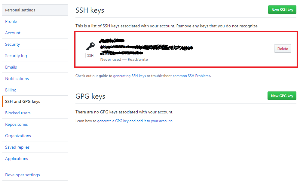 - 아래와같이 SSH key가 정상적으로 등록된다.