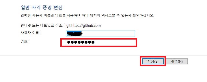 - 위에서 발급받은 personal access token으로 암호를 변경후 저장버튼을 클릭한다.