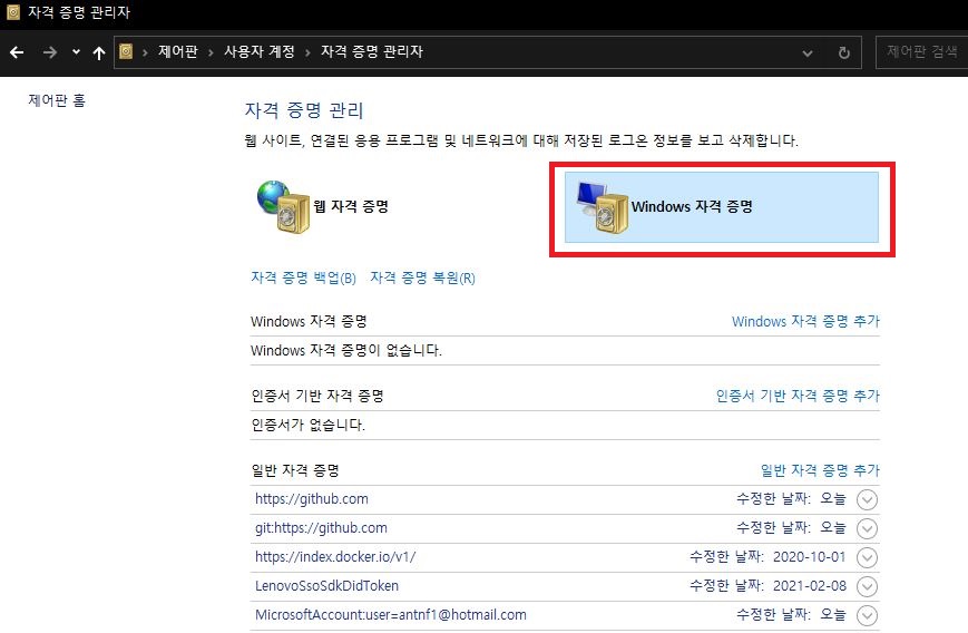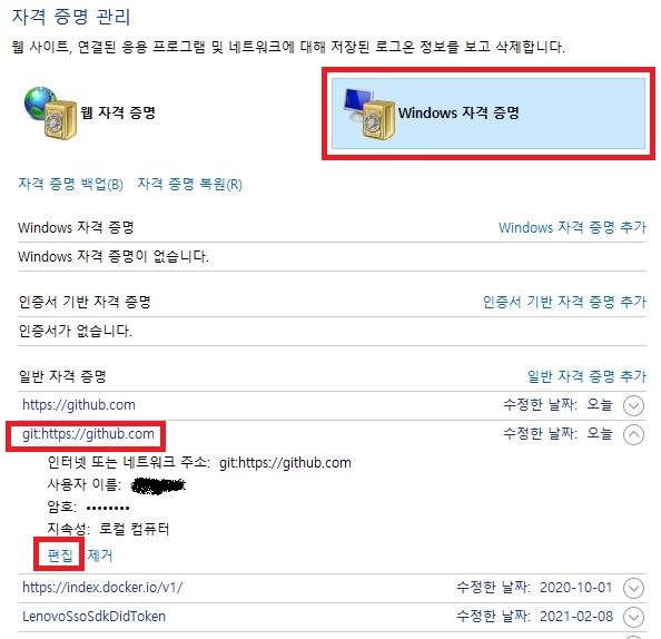 자격 증명 관리자 -> Windows 자격증명 -> git:https://github.com 에서 비밀번호변경