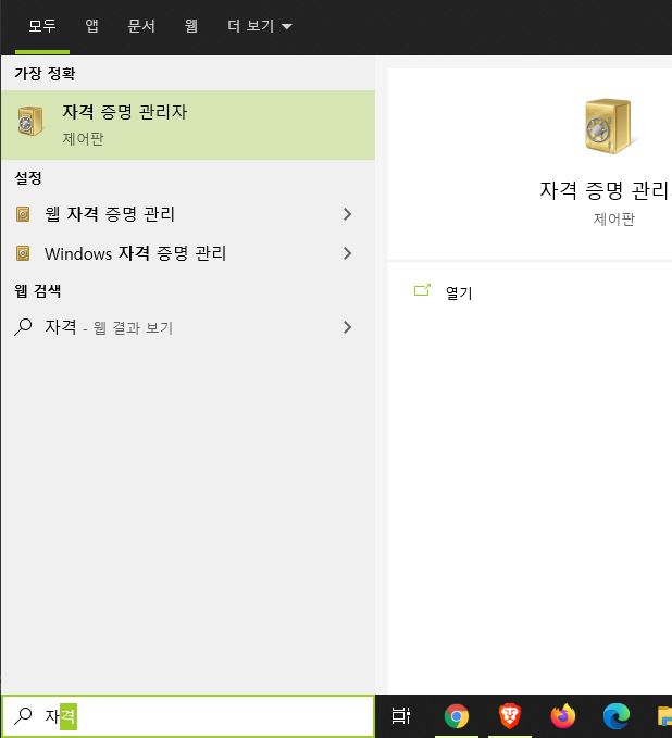 - 바탕화면 왼쪽하단의 검색영역에서 자격 증명 관리자를 검색하여 클릭한다.